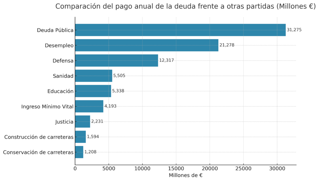 El presupuesto que estamos obligados a pagar anualmente por nuestra deuda es equivalente a todo el presupuesto anual combinado dedicado a: justicia, defensa, sanidad, educación, construcción de carreteras, conservación de carreteras y el ingreso mínimo vital.